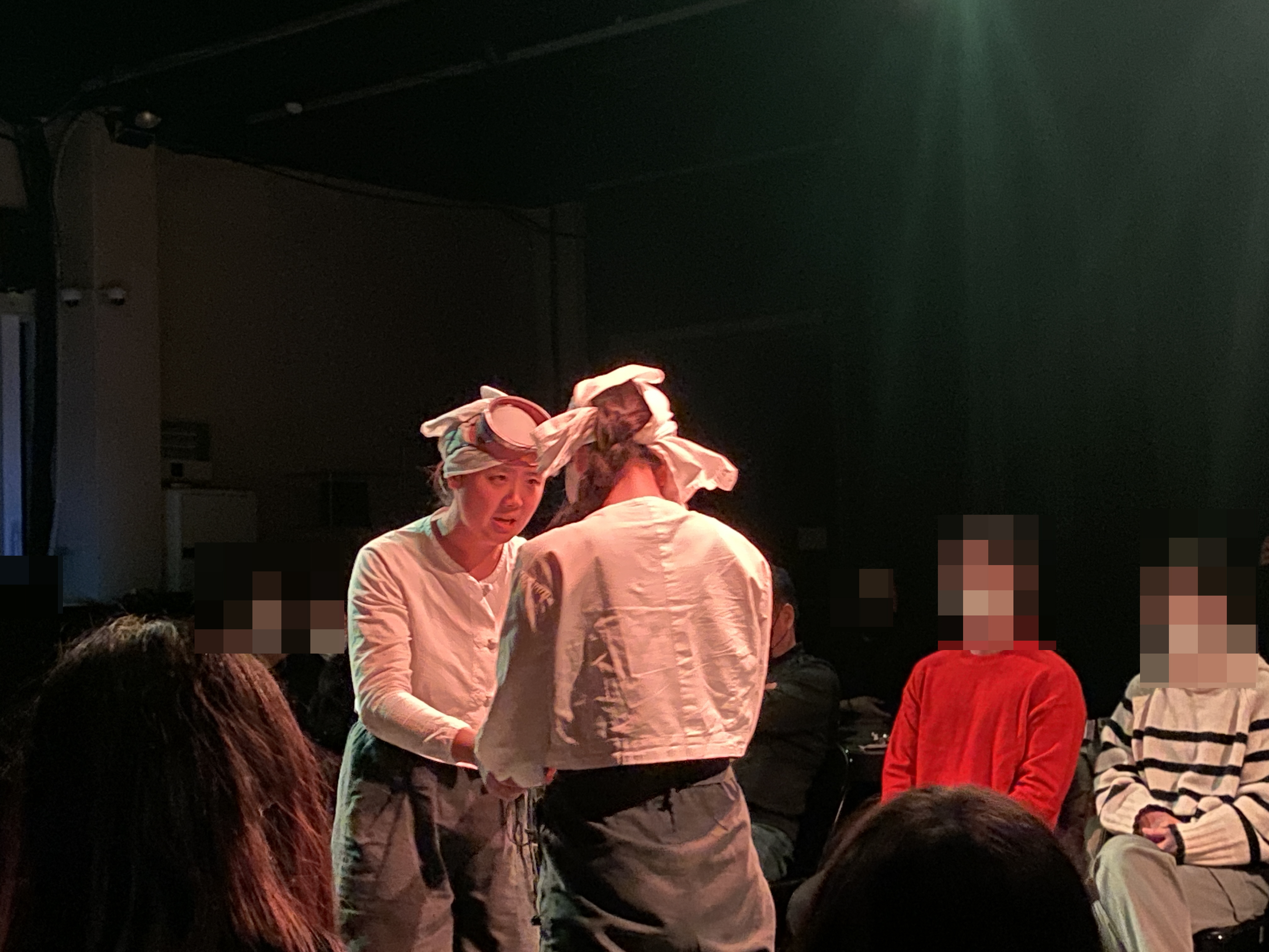 공연의 시작은 테이블과 테이블 중간의 공간에서 관객과 아주 가까이에서 그리고 테이블 너머로 바다의 배경으로..