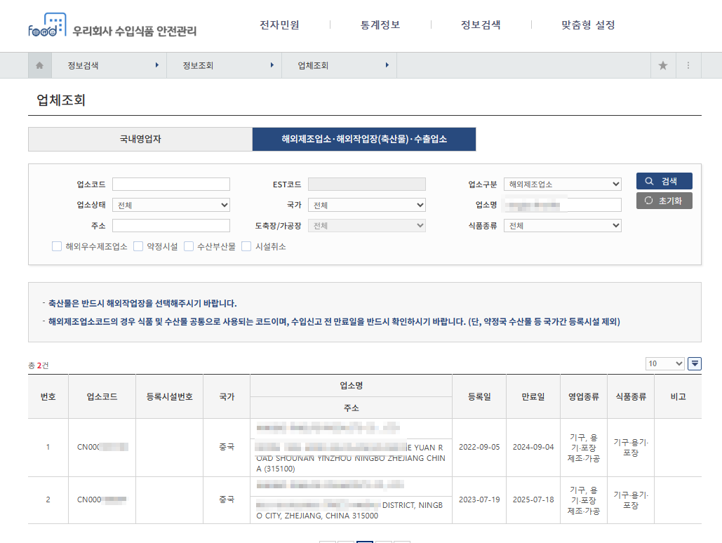 정보검색->정보조회-> 업체조회-> 해외제조업소. 해외작업장(축산물). 수출업소   들어가시면 업소명 넣어 조회해서